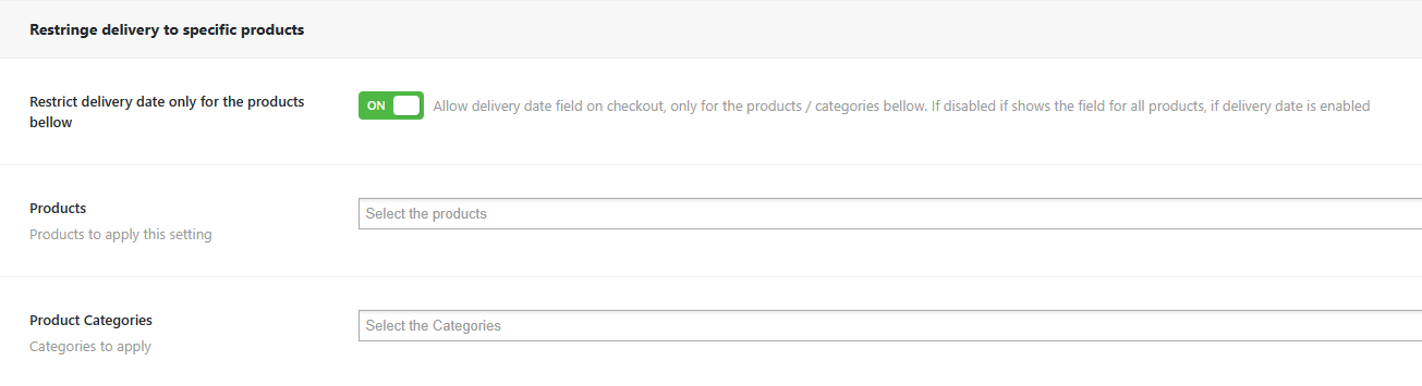 It shows the delivery date field only for the selected product / categories. If it is turned off, it will show delivery date field according the default “Enable delivery date” setting