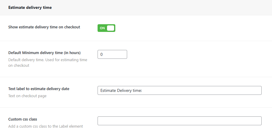 - Usually used if delivery date and pickup date are both disabled. It shows the estimated time for delivery based on the minimum preparation time (Default minimum delivery time in hours).