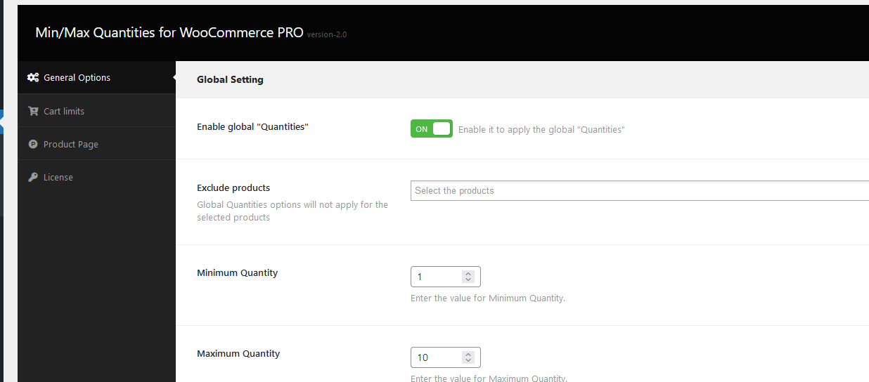 In General Options, you will see Global Setting. Enable global “Quantities” to apply the configuration globally in the store. This option will ensure that the minimum and maximum quantity rules you set will apply to all products across your store.