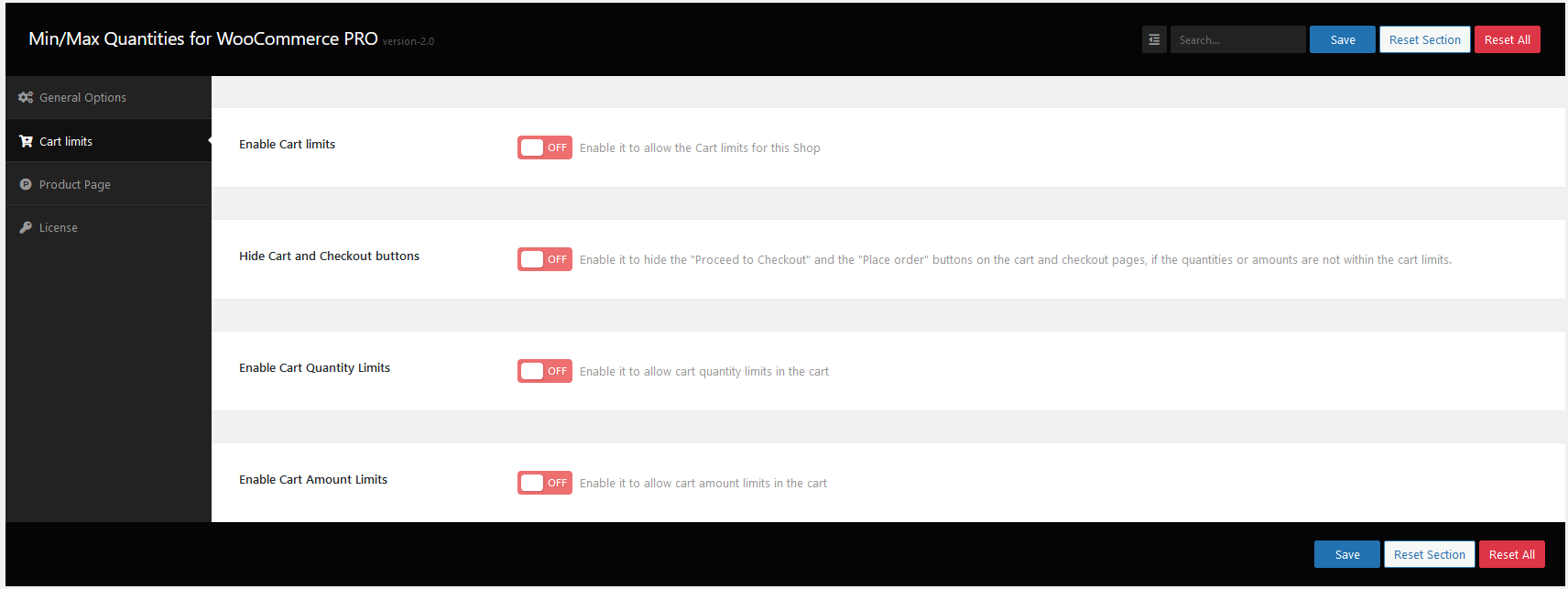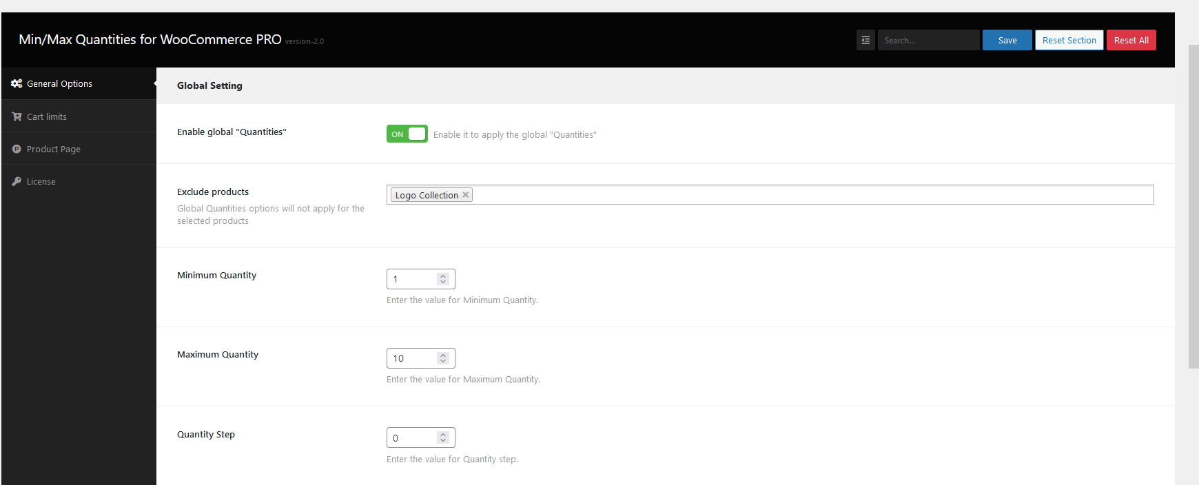 In General Options, you will see Global Setting. Enable global “Quantities” to apply the configuration globally in the store. This option will ensure that the minimum and maximum quantity rules you set will apply to all products across your store.